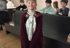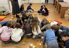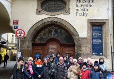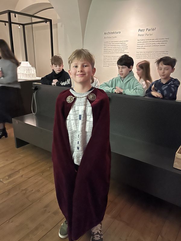 Ve vlastivědě jsme probírali osobu Karla IV. Paní učitelka našla výukový program Doba Karla IV. v Domě U Zlatého prstenu. Dům se nachází v Týnské uličce nedaleko Ungeltu, šli jsme kolem paláce U kamenného zvonu, kde se Karel IV. (Václav) prý narodil. Když jsme přicházeli k domu, viděli jsme zlatý prsten nade dveřmi. Dříve se nedávala domovní čísla, domy se poznávaly podle domovních znamení. Po vstupu do objektu nás všechny překvapila jeho rozlehlost a starobylost. Do šatny jsme sestoupili do rozlehlého podzemí. První expozice, kterou jsme viděli, byla veduta z roku 1601, sice z doby vlády Rudolfa II., ale byla úžasná, lodičky na Vltavě se pohybovaly, z komínů šel kouř, v popředí procházeli zbrojnoši i kupci. Pak jsme se již dostali do doby Karla IV. Dostali jsme za úkol sestavit z kostek obrázek. Ty nám dohromady ukázaly průběh života Karla IV. od narození, život ve Francii, návrat do Čech, stavební snahy i jeho smrt. Dokonce jsme měli vlastního krále, z krabičky jsme si vybírali kostky, ten který vytáhl kostku i s věžičkou, byl králem. Stal se jím Hugo I. Antonín. Proběhla korunovace biskupem Arnoštem z Pardubic, spolužák Honza mu předal korunu, žezlo i zlaté jablko. Viděli jsme modely staveb, které byly uskutečněny za doby jeho vlády. Vrcholem, který se nám všem líbil, byla světelná expozice přeměny Prahy. Jak se Praha rozrůstala, jak přibývaly i byly rušeny hradby, brány, náměstí i to největší ve střední Evropě, stavby domů, ulic, čtvrtí. Stavba kamenného mostu (dnešní Karlův) i s datem 1357 9. 7. 5:31. Je zajímavé, že se Karel po něm nikdy neprošel. I my stavěli po skupinkách podle fotografií zadané budovy a kostely. Zajímavostí bylo dost, jen si je všechny pamatovat. Na konec jsme šli do herny, kde jsou dobové převleky, které jsme si mohli obléci a vyfotografovat se. Exkurze se nám líbila a doporučujeme ji všem, kteří se jí nemohli zúčastnit, bavilo nás to tam. Pořad se nám líbil i proto, že nás prováděla velice příjemná paní.
