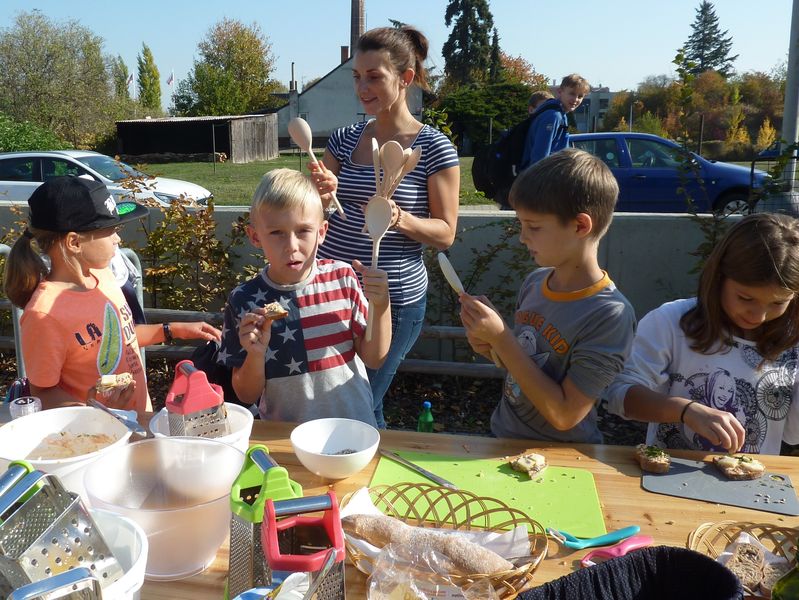 A protože bylo celý týden pěkné počasí vařili jsme venku pod širým nebem. Na úvod jsme si povídali o tom, co a jak správně jíst, jak by měla taková zdravá svačinka vypadat a pak už hurá do práce. Ukázalo se, že je mezi námi spousta šikovných kuchtíků, kteří dokáží strouhat, krájet, míchat, zdobit. Na vlastnoručně připravené zdravé svačince si pak každý kuchtík pochutnal. S sebou domů si děti odnášeli nejen nové zkušenosti a vědomí, že si dokáží takovouto svačinku i sami připravit, ale také recept a to hlavní, kuchařskou vařečku.