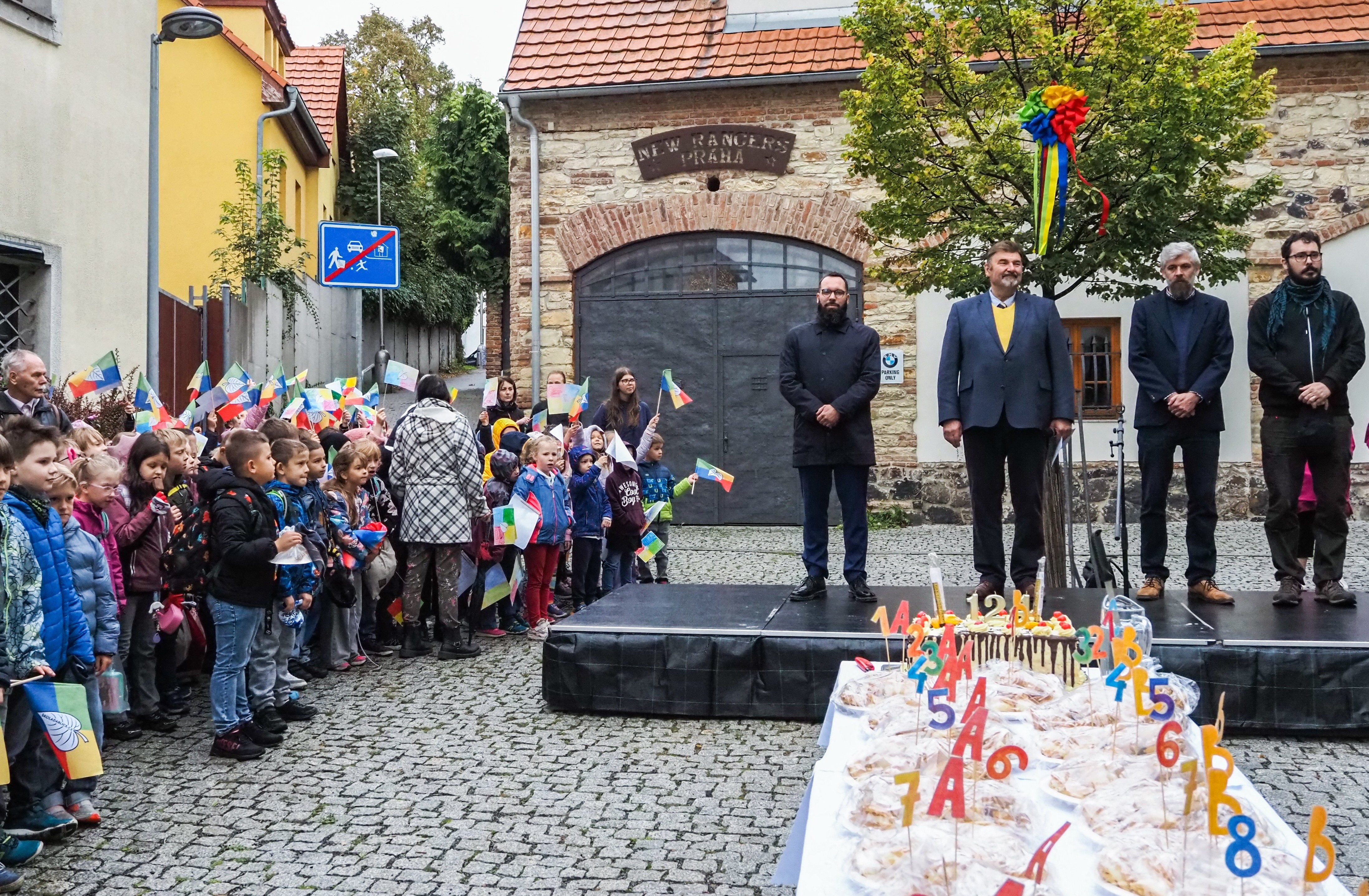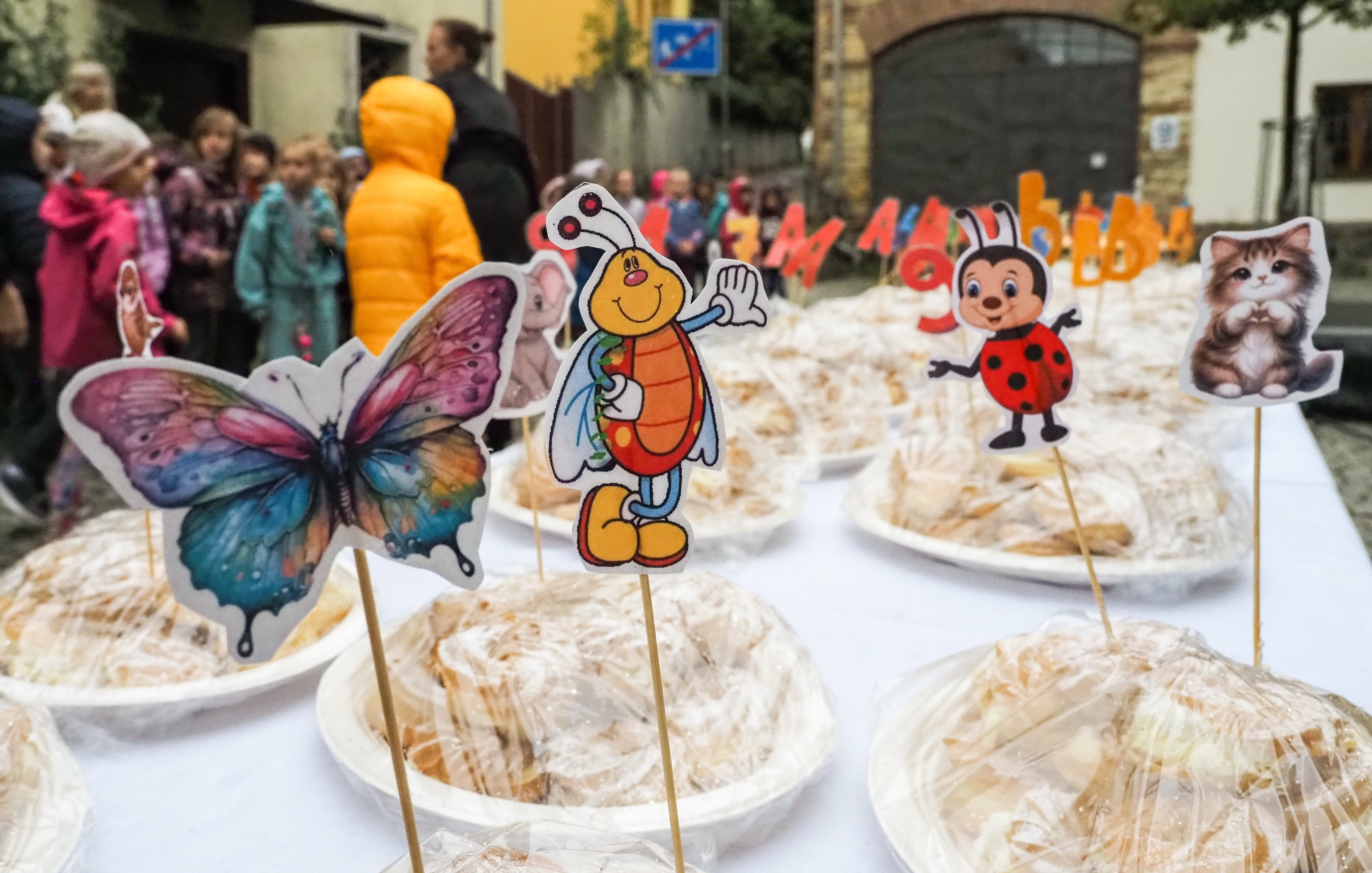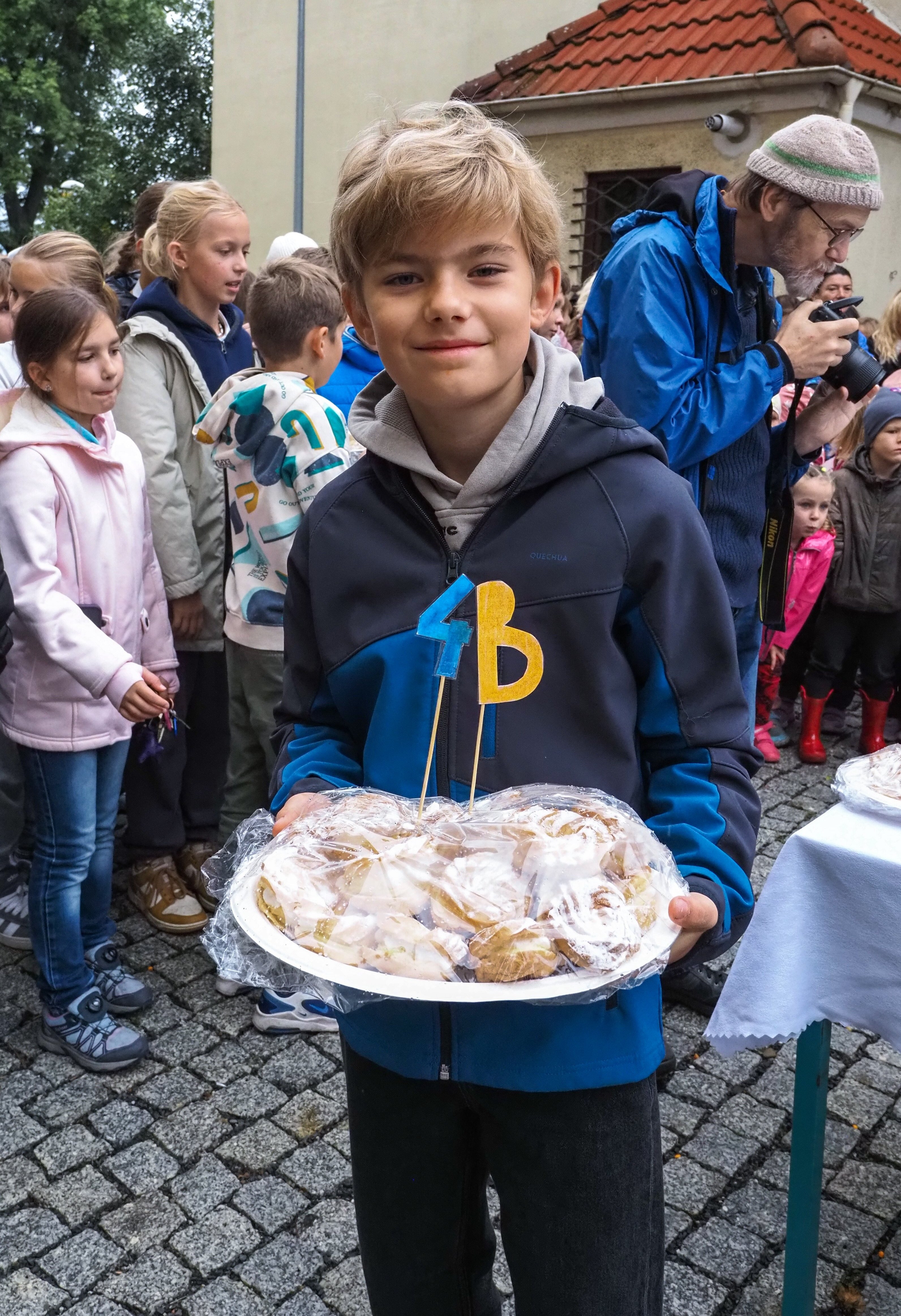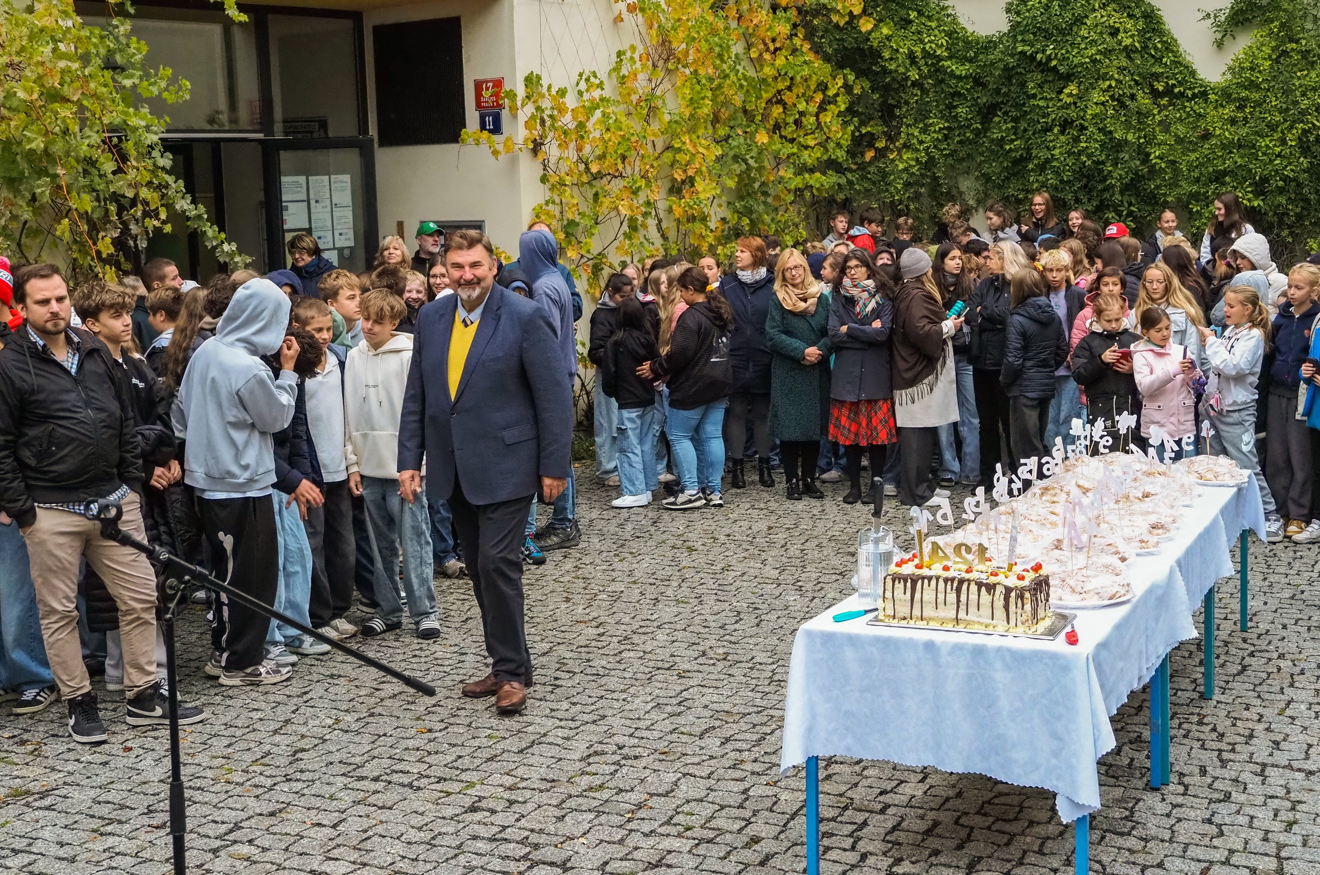 Letošní narozeninový den školy opět provázela cvičná evakuace. Shromáždění rozjívených žáků pod borovicemi u pomníku padlých se od pana ředitele nejprve dozvědělo, že jde o důležitou věc, které bychom všichni měli věnovat pozornost. Následovalo pozvání k přesunu na rynek, kde měla jako obvykle proběhnout oslava. Na ozdobených stolech čekal na každou třídu tác s minivěnečky, které připravily paní kuchařky. Učitelskému sboru se dostalo robustního vícepatrového dortu. Škole popřál vše dobré do dalších let pan starosta a paní místostarostka, která se postarala o menší pozdvižení pozdním příchodem. Nakonec v dobré náladě společně zapálili a rozkrojili narozeninový dort.