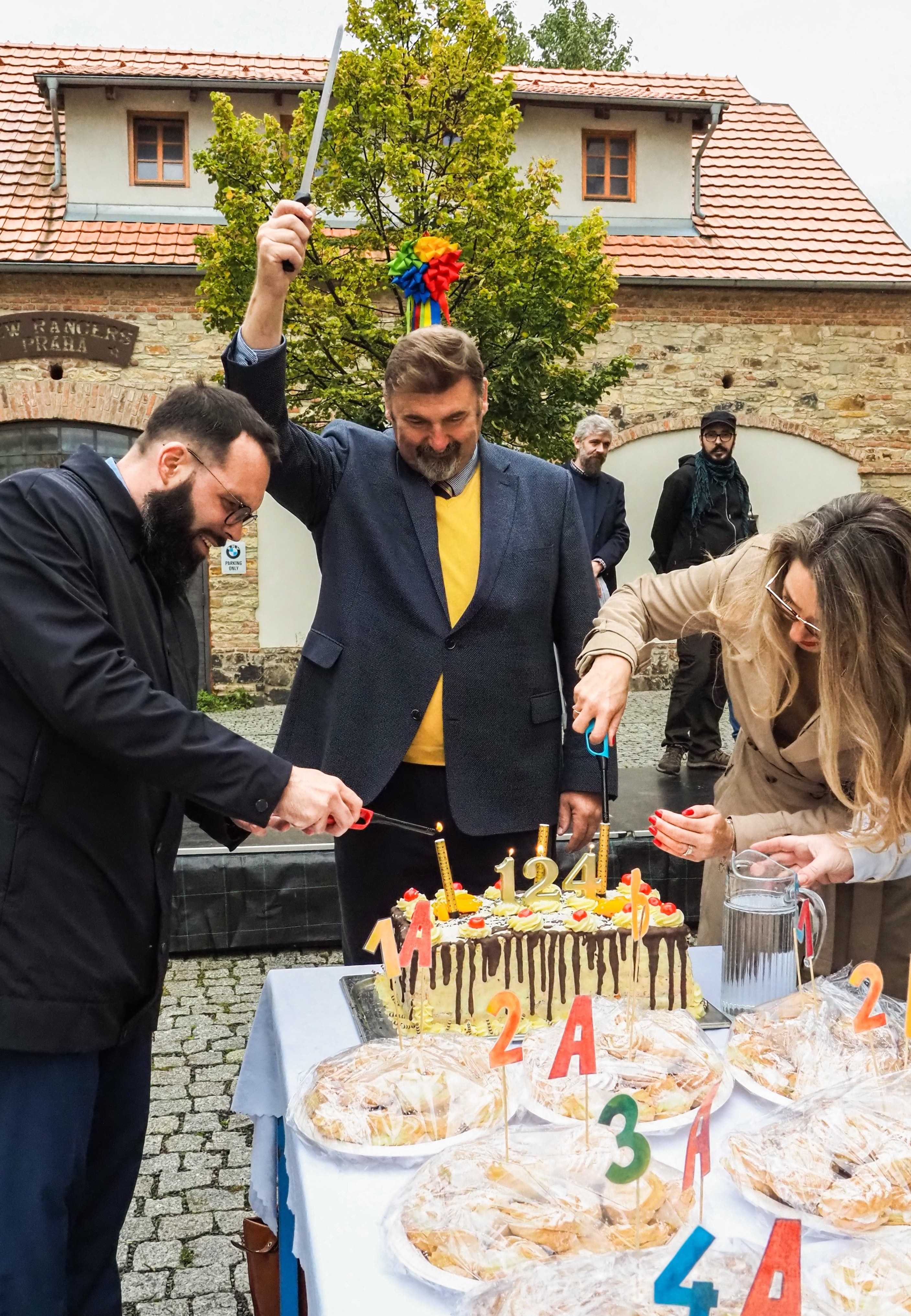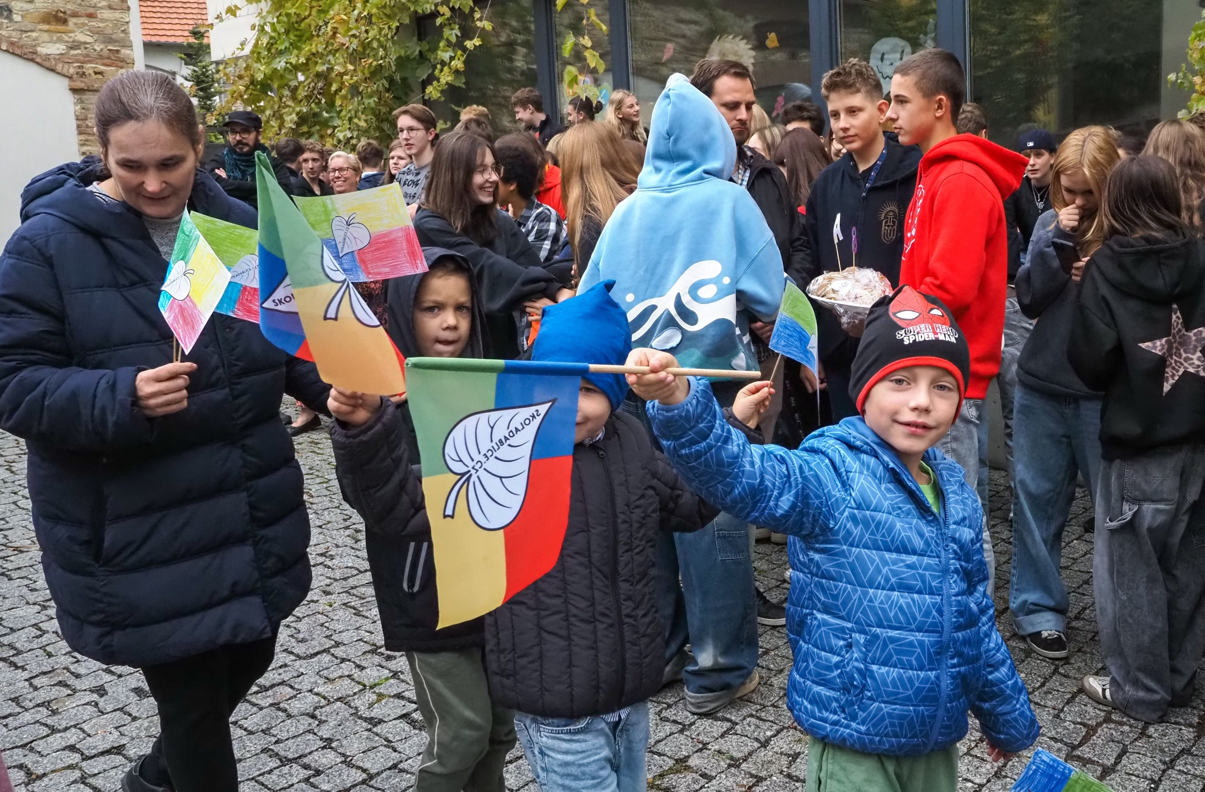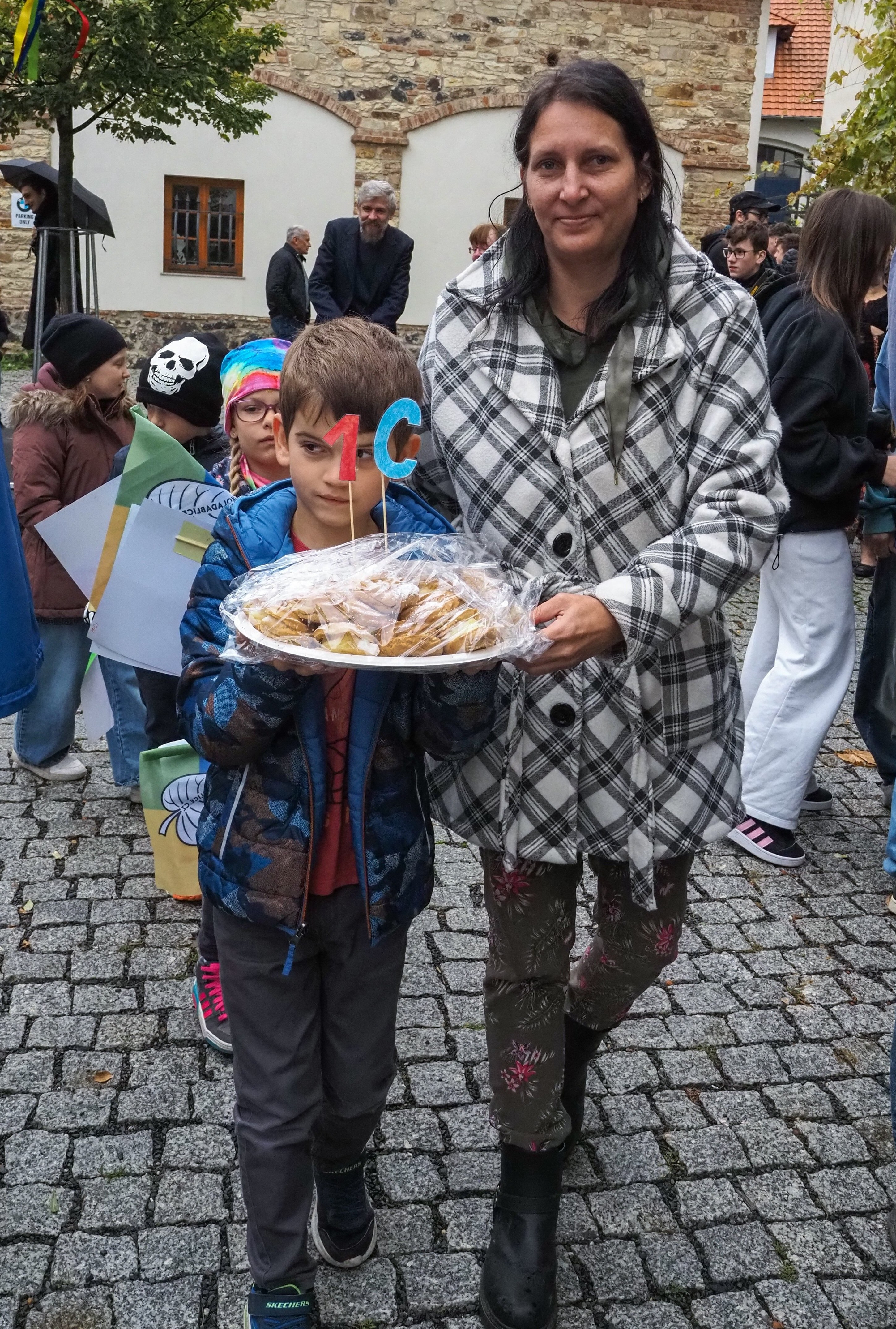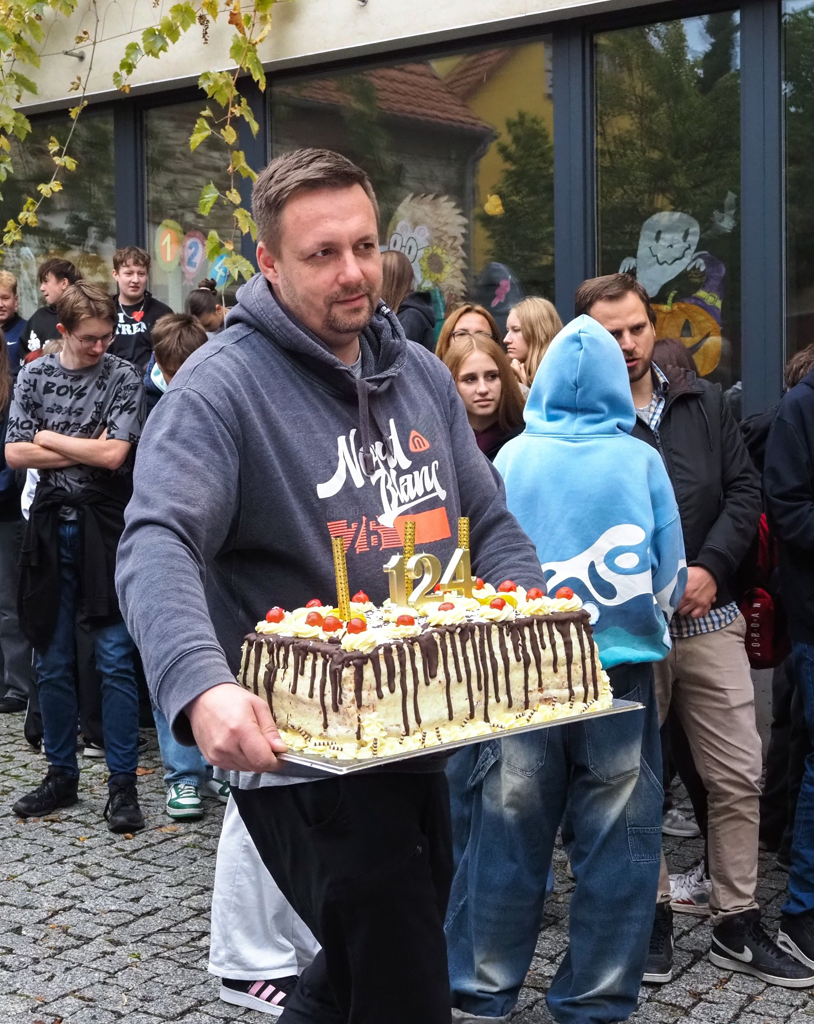 Letošní narozeninový den školy opět provázela cvičná evakuace. Shromáždění rozjívených žáků pod borovicemi u pomníku padlých se od pana ředitele nejprve dozvědělo, že jde o důležitou věc, které bychom všichni měli věnovat pozornost. Následovalo pozvání k přesunu na rynek, kde měla jako obvykle proběhnout oslava. Na ozdobených stolech čekal na každou třídu tác s minivěnečky, které připravily paní kuchařky. Učitelskému sboru se dostalo robustního vícepatrového dortu. Škole popřál vše dobré do dalších let pan starosta a paní místostarostka, která se postarala o menší pozdvižení pozdním příchodem. Nakonec v dobré náladě společně zapálili a rozkrojili narozeninový dort.