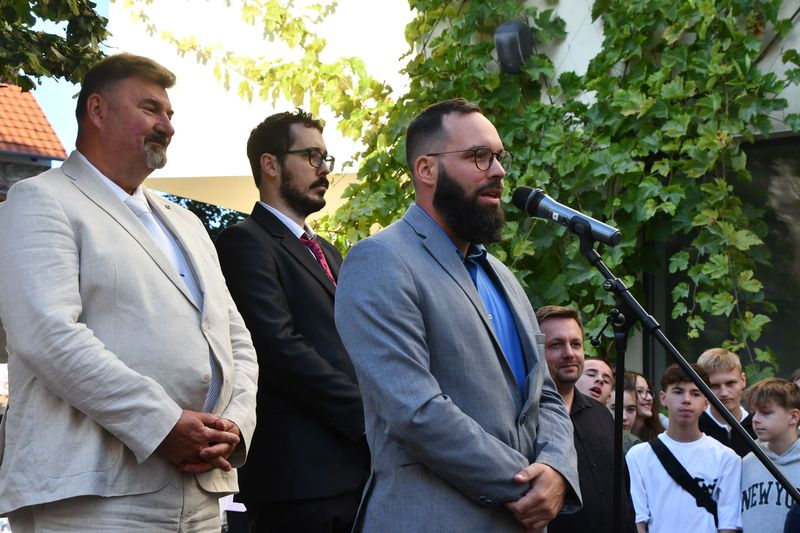Na pódiu stál pan ředitel Josef Buchal se svými zástupci panem Tomášem Novotným, Jiřím Zemanem a Věrou Dusovou. Pozdravit všechny přišel pan starosta Martin Tumpach a také nás navštívil velmi vzácný host, emeritní děkan pedagogické fakulty Michal Nedělka.