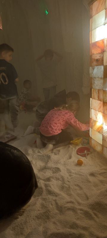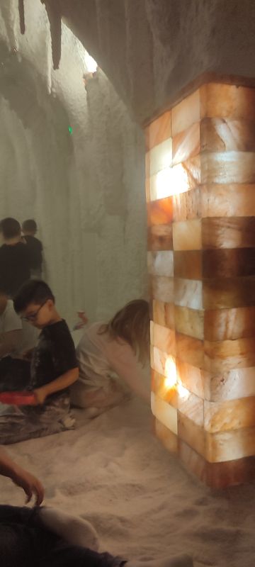 Letos zkoušíme novou solnou jeskyni na Krakově. Je menší a podlaha solné jeskyně je pokrytá velmi jemnými krystalkami soli, téměř až solným pískem. Díky tomu se děti dokonce musely před odchodem oprášit košťátkem. Jinak by vypadaly jako sněhuláci. Je zde i výrazněji cítit vůně soli a minerálů, než tomu bylo v předešlé solné jeskyni v Letňanech, kde byly solné krystalky hrubší.